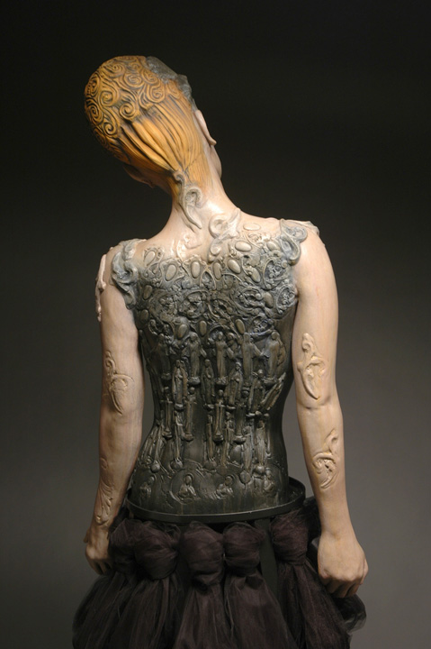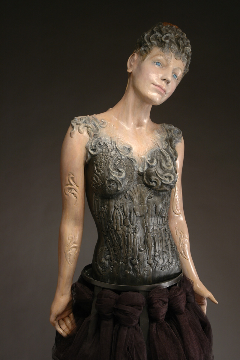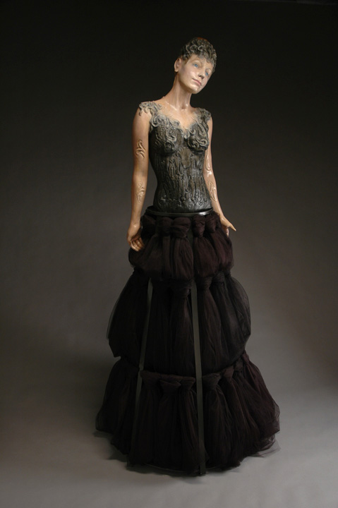 Porcelain figure stained and painted on welded steel base covered in tulle