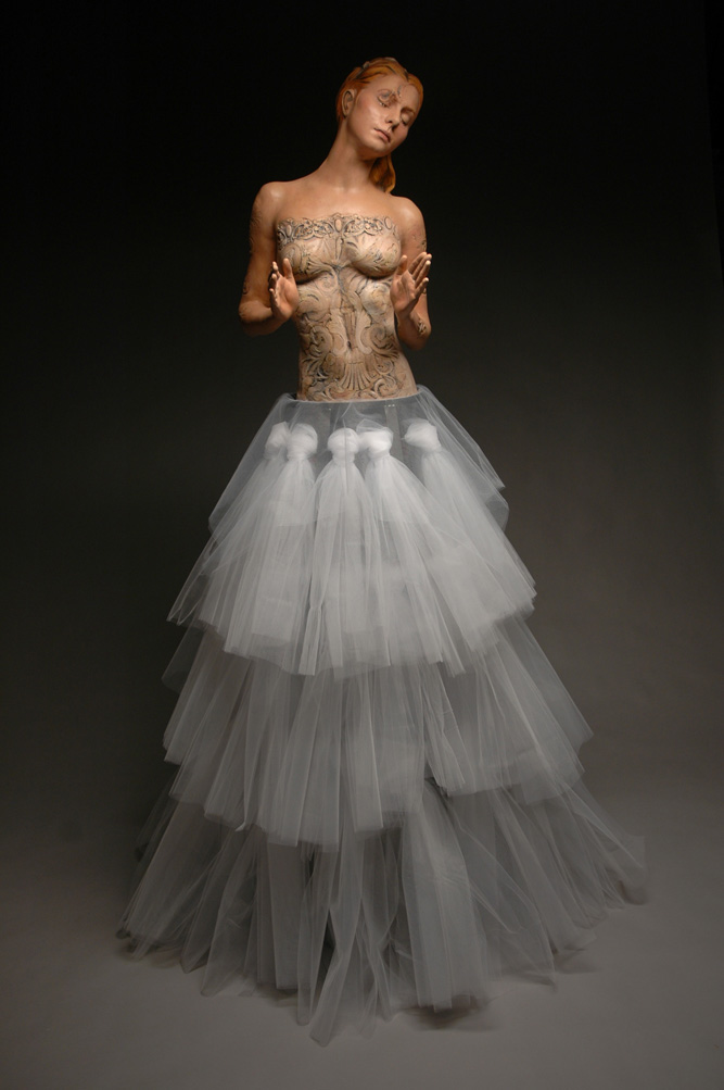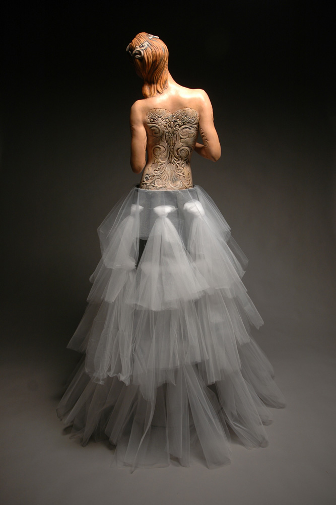 Porcelain figure stained and painted on a welded steel skirt covered in tulle
