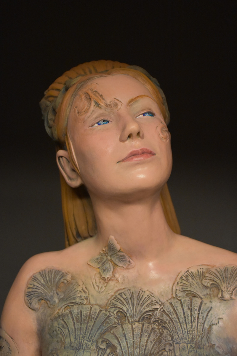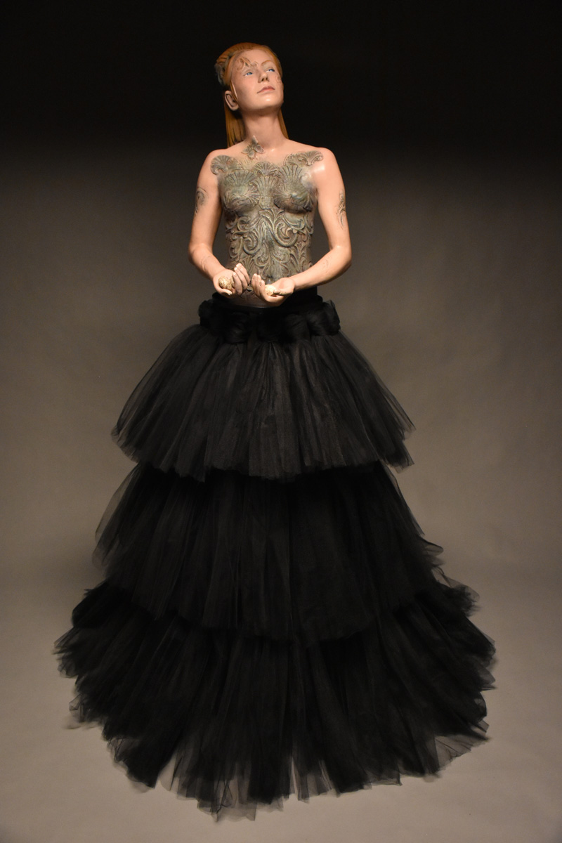 Porcelain figure stained and painted holding cocoons on a steel skirt covered in tulle
